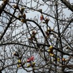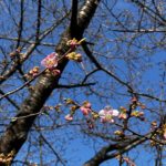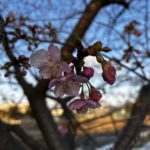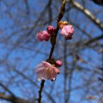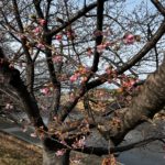 2026年の葵桜の開花が始まりました。昨年に比べると約3週間ぐらい早いペースです。2月11日の雨上がりの午後に、すでに一輪二輪咲き始めた桜を見つけました。今週末(2月14日、15日)は気温が15度近くまで上がると予想されているので、竜美丘会館近くの日照条件のいい木は一分咲きぐらいになりそうです。